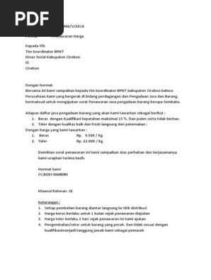 Kegiatan dasar dari suatu perusahaan yang bergerak dalam bidang bisnis adalah penjualan dan pembelian. Banyak orang yang berfikir jika pembuatan surat penawaran tidaklah. Demikian potingan kali ini mengenai contoh surat permintaan penawaran yang simpel dan benar. Oleh karena itu membuat surat penawaran dengan baik sangat diperlukan agar kerja sama bisnis bisa berjalan dengan lancar. Pemesanan akan kami lakukan setelah kami.