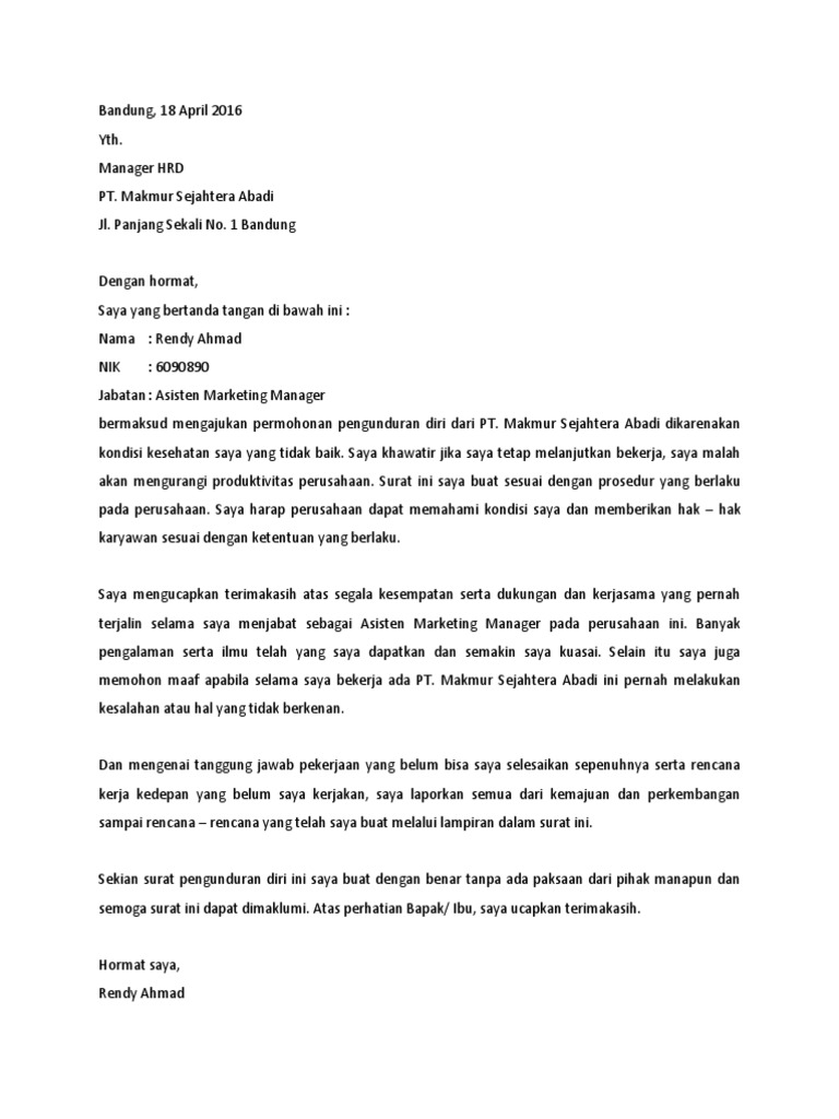 101 contoh surat pengunduran diri profesional dari pekerjaan yang benar dan etikanya serta mengajukan pengunduran diri dari pt intan permata lokal dengan alasan kepindahan keluarga surat pengunduran diri kerja format 3. Keadaan ayah saya yang saat ini sakit di lampung, mengharuskan saya kembali ke lampung. Alasan pengunduran diri seoarang karyawan bisa beraneka ragam. Contoh surat pengunduran diri ini dapat kamu gunakan untuk memberikan kesan dan alasan yang baik, serta tetap menghormati atasan untuk pada umumnya surat pengunduran diri serupa dengan surat lamaran kerja. Sebagai salah satu jenis surat penting yang ditujukan untuk memutuskan hubungan kerja dengan perusahaan. Berikut adalah beberapa contoh surat pengunduran diri kerja yang baik dan benar, semoga bisa menjadi bahan referensi untuk anda. Surat pengunduran diri kerja atau resign letter adalah surat pernyataan bahwa seseorang mengundurkan diri dari pekerjaannya dengan suatu alasan tertentu. Contoh surat pengunduran diri dari rumah sakit. Surat ini harus berisi alasan yang logis dan masuk akan agar pengunduran diri kamu dapat diterima dengan baik oleh perusahaan. Pada paragraf kedua setelah penjelasan alasan mengundurkan diri, jangan lupa sampaikan rasa terima kasih demikian surat pengunduran diri kerja ini saya buat dengan penuh kesadaran serta atas keinginan sendiri. Karena faktor kondisi kesehatan yang sudah tidak memungkinkan lagi untuk dapat bekerja dengan baik. Jenis surat ini dibuat untuk anda yang akan mengundurkan diri dari tempat kerja yang di isinya berikut adalah contoh surat pengunduran diri dari pekerjaan yang disertai dengan suatu alasan. Mulai dari kejenuhan atau bosan, ketidak cocokan dengan.