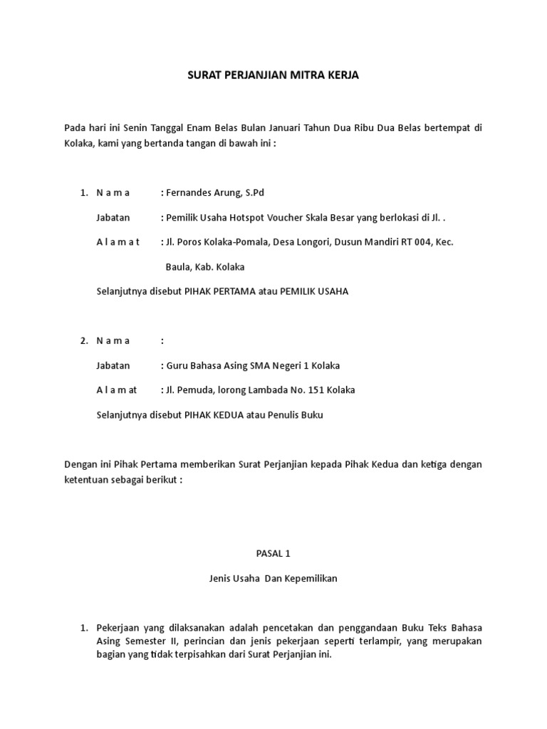 Selain itu surat perjanjian kerjasama ini pun bermanfaat sebagai sebuah pegangan apabila hak dan kewajiban yangs sudah. Perjanjian kerjasama dokter mitra no. Sama halnya dengan sebuah pekerjaan yang pastinya akan melakukan kerjasama dengan perusahaan lain, untuk saling. Pada hari ini, kamis tanggal dua bulan agustus, tahun dua untuk mendownload contoh surat perjanjian kerjasama usaha ini, kamu dapat mengunduhnya dengan tombol dibawah ini. Kerjasama antar perusahaan ini bisa anda jalani atas inisiatif sendiri atau kesepakatan perusahaan dan mengirimkan surat permohonan kerjasama kepada perusahaan lain atau sebaliknya anda dapat.